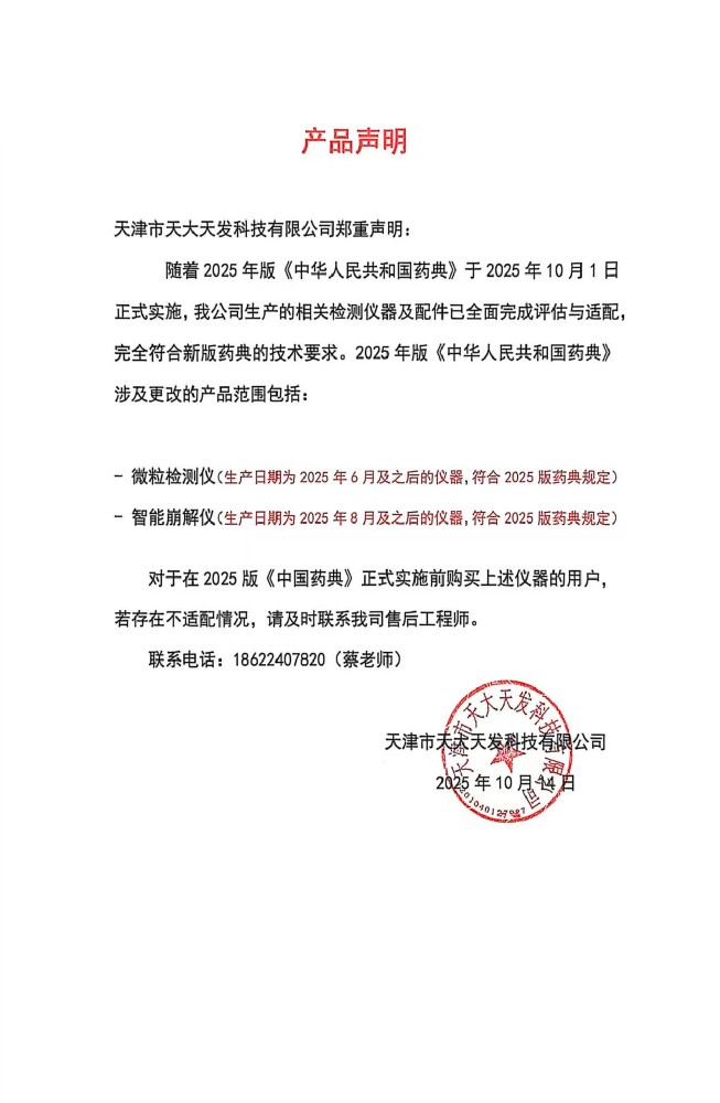 聲 明鑒于2025版《中國藥典》的更新,為保障天大天發(fā)忠實用戶的切身利益,凡在2025年之前購置我公司設備的客戶,若您的設備未能滿足新版藥典的要求,我們將提供升級服務。涉及產(chǎn)品:微粒檢測儀:GWJ-1···...